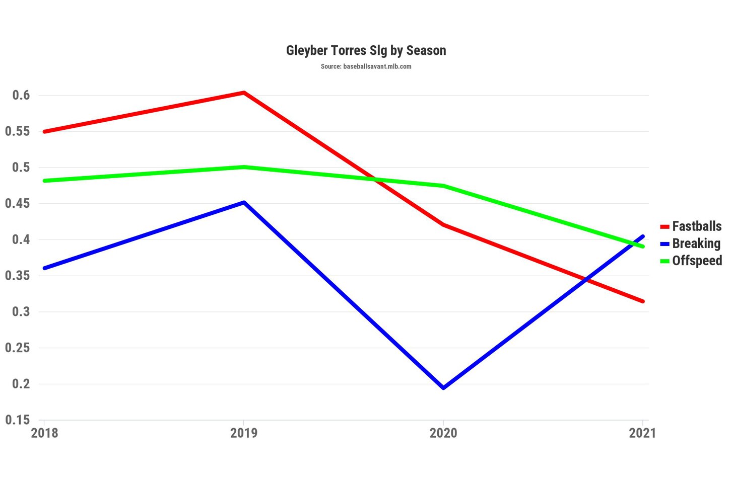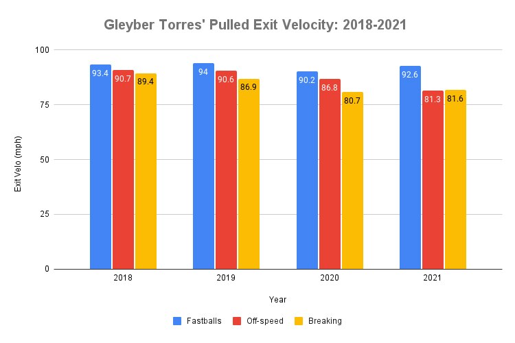 You might think this is a swing-and-miss problem, yet Torres' whiff rate against fastballs is actually down from his first two seasons. For that matter, his average exit velocity against fastballs is only 0.2 mph lower than it was in 2019.