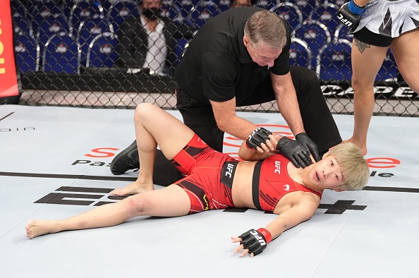 Gomez Juarez successfully defended a takedown against aggressive opponent Liang Na and quickly got the fight back to the center of the Octagon, where she proceeded to land a sweeping right hand followed by a pair of precise left hooks that left Na flat on her back.