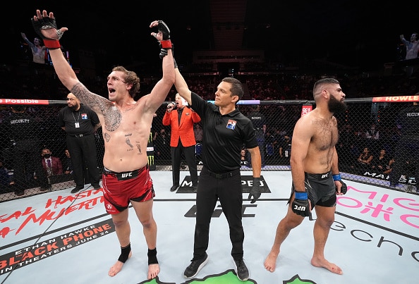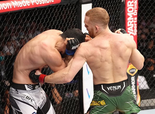 Emeev was aggressive, got the fight to the mat shortly after the initial glove touch and was chasing choke submissions before Della Maddalena managed to regain his feet about two minutes in. The battle went to the perimeter of the cage soon after, and it was there where Della Maddalena landed a hard left hook to Emeev’s right side that instantly crumpled him to his knees.