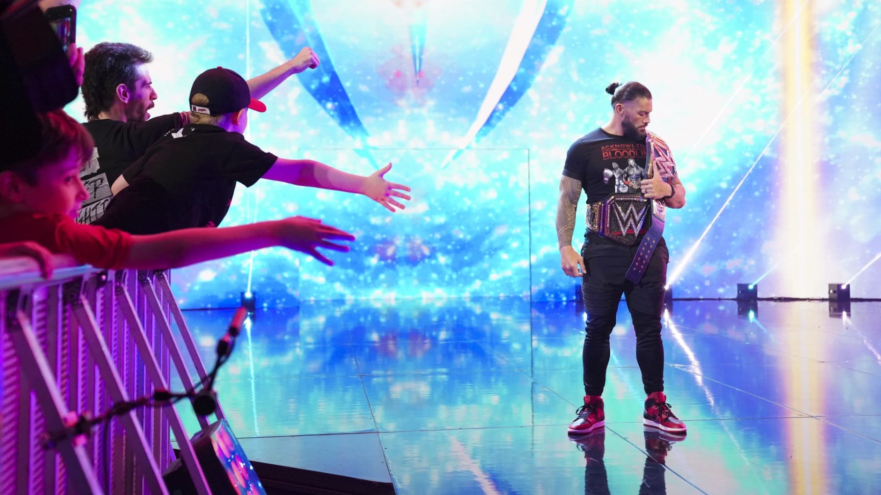 Reigns, the defending champion, entered the arena on his own. There was no Paul Heyman and no Jimmy and Jey Uso. Even Sami Zayn was nowhere to be seen as The Tribal Chief made the long walk to the ring, without pyro due to the stadium setup.