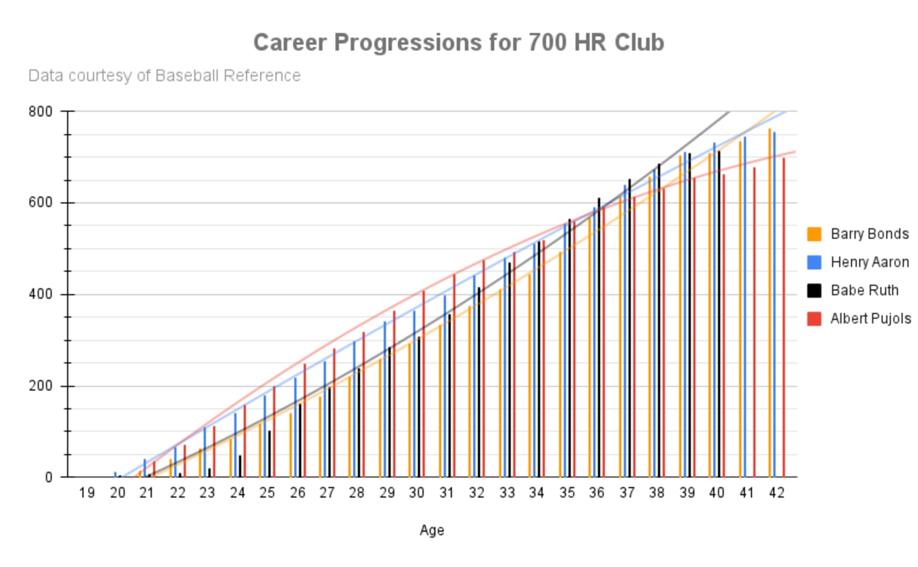 The stories are in the trendlines, which display similar trajectories for Ruth and Bonds and different ones for Aaron and Pujols.