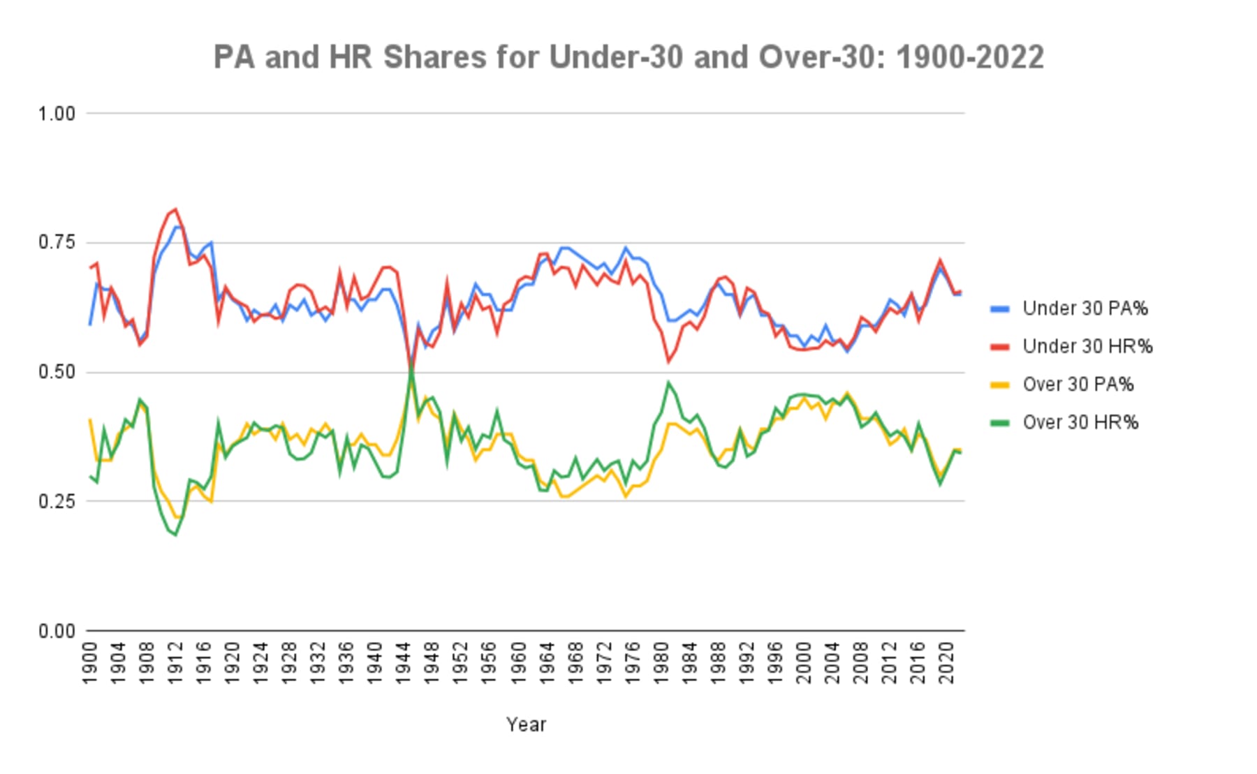 The outlawing of PEDs in 2005 helps explain why the lines for under- and over-30 hitters have diverged of late, but there's also more to the story. Teams simply value young talent more nowadays. And at least in theory, youthful athleticism is helpful with hitting the high-octane fastballs and swing-and-miss breaking balls that have proliferated in recent years.