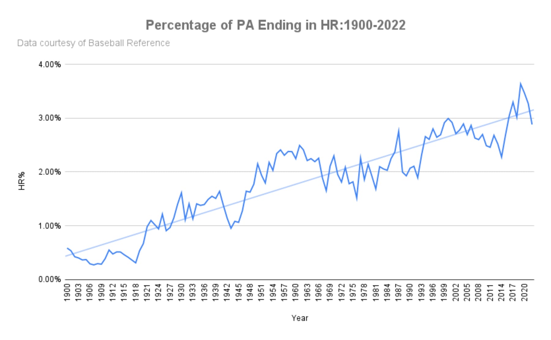As much as it might seem like home runs are a strictly modern phenomenon, the truth is that they've been growing in frequency for a very long time. There's basically been no going back since Ruth broke his own home run record by a full 25 dingers back in 1920.