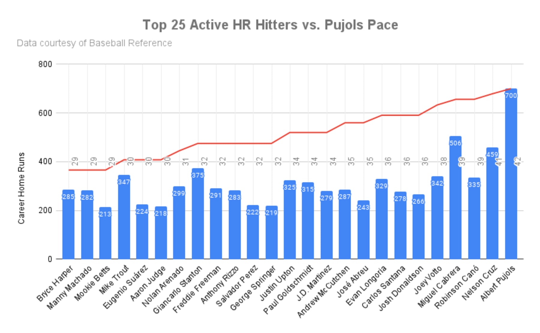 Here's a look at the top 25 active home run hitters in MLB right now, ordered from youngest to oldest and compared to where Pujols' home run count was at that age: