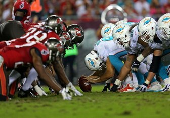 Mike Pouncey earns an unnecessary roughness penalty after hitting a Buccaneer after a play where Ryan Tannehill completed a 10-yard pass to Brian Hartline.
