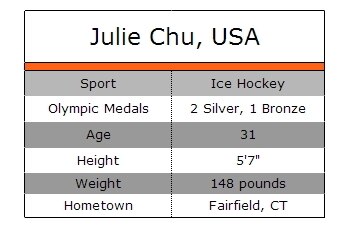 Crash Course: Julie Chu is a forward preparing to play in her fourth Olympic games in Sochi, Russia. She has been on three medal-winning Olympic hockey teams (two silvers and one bronze) and is considered a near-lock to once again make the team. A team captain in the past, Chu is known for investing in the success of her teammates.