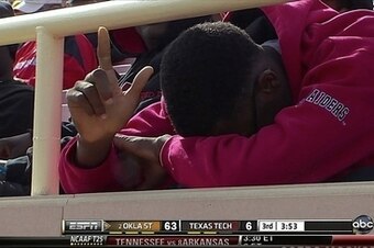 In 2011 Oklahoma State absolutely humiliated Texas Tech, defeating the Red Raiders at home 66-6. CBS Sports named this guy the only winner from Texas, trumpeting his "GUNS UP" attitude despite the obvious futility.