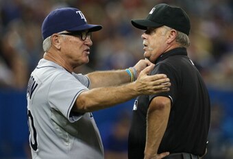 Like a true performer and cheeky lunatic, Maddon responds to a threat of ejection by expressing his adoration for umpire Ted Barrett. Maddon's advances are spurned and, despite the loving gesture, the Rays manager is rejected—I mean ejected.