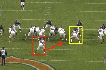 The play is a run to the right side, directly attacking McClellin. The Giants are double-teaming Chicago’s defensive tackles, Corey Wootton (No. 98) and Landon Cohen (No. 97). McClellin, meanwhile, is left one-on-one with Giants tight end Bear Pascoe (No. 86).