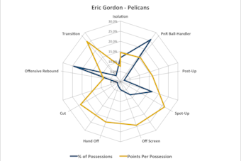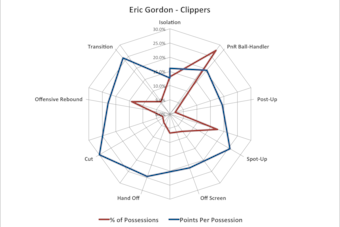 The graph highlights a few different things. We can see the significant portion of offense Gordon created for himself, through isolation and in the pick-and-roll, with a high level of efficiency. He was viciously explosive off the dribble in those days and often needed nothing more than his first step and the threat of a ball screen to get himself all the way to the basket.