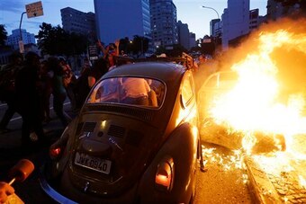 About 2,500 protesters took to the streets of Sao Paulo this past weekend to voice their frustrations with the Brazilian government and FIFA, international football's governing body, in a demonstration that turned violent, per Moises Avila of Yahoo! News. Military police reported 128 arrests, as windows and other structures were attacked by more radical protesters.