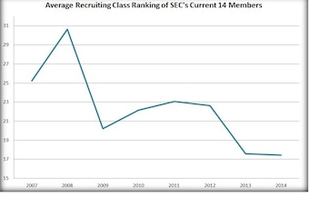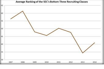 The only definitive trend in the SEC within the realm of recruiting is a vast improvement coinciding directly with the conference's recent run of success. The graph below demonstrates the conference's average recruiting class ranking since 2007 (the first class following the SEC's first of seven consecutive BCS National Championships). For ease of comparison, all 14 current member institutions were included in each year (even though Texas A&M and Missouri did not join the league until 2012).
