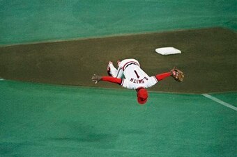 After all, the only thing Smith was known more for than doing backflips (pictured) was his outrageous wizardry with the glove. Having started his career with the San Diego Padres, Smith was traded to the St. Louis Cardinals in 1981 and proceeded to win the final 11 of his 13 consecutive Gold Gloves—most ever for the position.