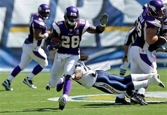 It's one of the greatest single-game performances by a running back in NFL history. Against the San Diego Chargers, rookie Adrian Peterson carried 30 times for 296 yards and two touchdowns.