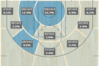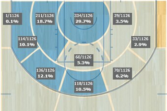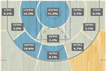 Notice how the majority of Aldridge's attempts came within a few feet of the rim, with significant (but not overwhelmingly so) shares on the left block and the left wing.