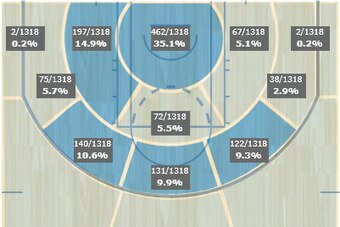 The following year, Aldridge converted a career-high 51.2 percent of his looks, despite his near-rim attempts constituting a mere plurality of his shots and taking more of his tries from the aforementioned spots on the left block and left wing, in addition to those from straight away: