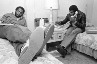 This is, quite simply, one of the greatest locker room photos of all time. Dr. J is just working it from head-to-toe. The afro, the gold medallion, the turtleneck-sweater combo and the wicked plaid pants are just too amazing for words. Add to that the Harlem Globetrotters basketball spin and it’s like the first time I heard the Beatles.