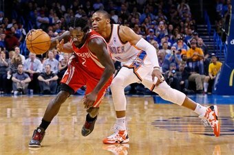 There were few such concerns against Houston, which brought its fifth-ranked offense and five-game winning streak to the Sooner State. The Thunder held the Rockets to 41.8 percent shooting from the field, with Houston's Big Three of James Harden, Dwight Howard and Chandler Parsons combining to convert just 19 of their 50 attempts—a 38 percent clip, for those of you keeping score at home.
