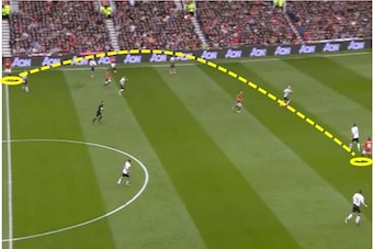 These positional errors leave centre-backs Phil Jones and Vidic exposed and under pressure from Allen’s run, as Vidic (yellow circle on the right) is also dragged toward the ball and thus behind Allen’s run (white arrow).