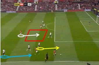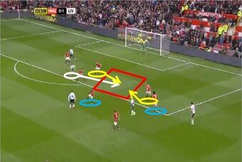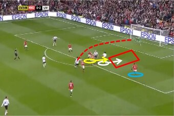 However, Gerrard’s run toward United’s right means that his customary central defensive midfield zone has been left vacant, leaving a huge gap in the middle (red box) for Wayne Rooney (white circle) to storm into.