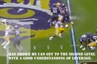 He shows functional strength in his game tape, however, and at times he displays signs of becoming a dominating run-blocker. He doesn't have big hands, but he has strong ones. He also has fairly long arms that he uses well to extend his physical presence on the edge like an octopus with its feelers out. He packs a very solid initial punch and typically delivers it with excellent placement.