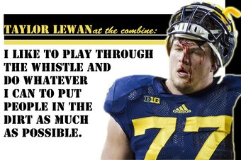 Lewan was one of the lone bright spots on a Michigan offensive line in 2013 that, at times, played a disastrous brand of football. Clearly, the athletes in Michigan's trenches were frequently frustrated. In evaluating Lewan, "toughness" should be the furthest consideration from any evaluator's mind. He hung in through games and competed as the line's best weapon and was even seen, as above, playing with blood dripping down his face.