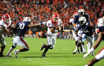 Auburn had a huge lead in this game last season, only to see Georgia rally late and put in severe danger the Tigers' hopes for a national title appearance. Faced with a 4th-and-long with time running out, Nick Marshall had to drop back and throw deep in hopes that Ricardo Louis would haul in the pass. He did, but only after it bounced off the hands of Georgia defensive back Josh Harvey-Clemons and into Louis' hands for a game-winning 73-yard touchdown pass.