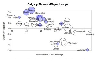 Matt Stajan and David Jones are noteworthy for taking on the tough minutes, with the latter especially coming on in the second half. Paul Byron was a pleasant surprise, becoming much more effective when used in a less defensive-focused assignment in the second half.