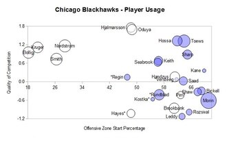 One look at the chart and you can see the difference between superstars like Patrick Kane and elite players like Marian Hossa, Jonathan Toews and Patrick Sharp. They do their jobs against the top opponents, and while dominating the possession game.
