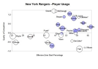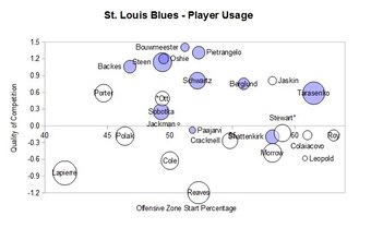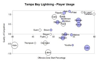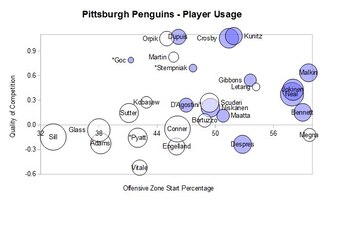 A player usage chart helps you see the difference between top shutdown players like Sidney Crosby, Chris Kunitz and Pascal Dupuis and scoring-oriented players like Evgeni Malkin, James Neal, Jussi Jokinen and Beau Bennett. The former take on top lines and in both zones, while the latter takes on second lines in primarily the offensive zone. It's much easier to dominate possession in that second case.