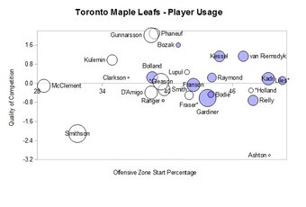 Toronto's top forwards, especially in the second half, were Tyler Bozak, Phil Kessel and James van Riemsdyk who faced the team's top opponents in increasingly offensive-minded order.