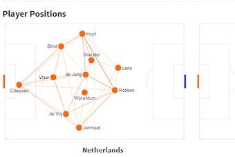 Netherlands lined up in their 3-5-2/3-4-1-2 formation with a few forced changes. Jeremain Lens replaced Robin van Persie (suspension), Daley Blind moved in to replace Bruno Martins Indi at centre-back (concussion) and Dirk Kuyt slotted in at wing-back.