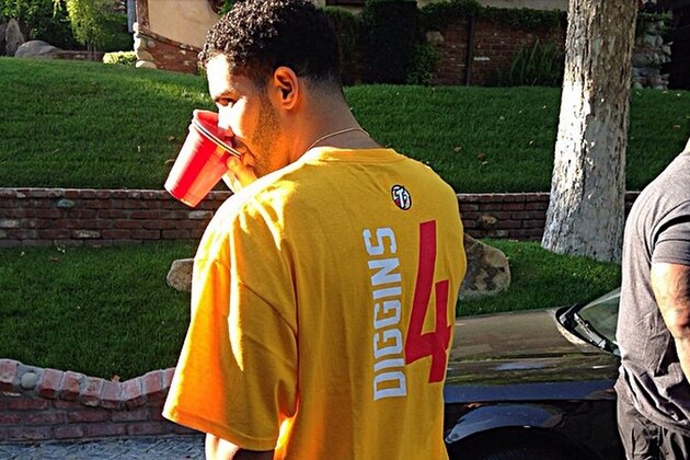 Drake uploaded his latest Diggins-centric image on Tuesday night. The picture shows the rapper in a yellow, No. 4 Tulsa Shock shirt, sipping thirstily from not one, but two red cups.