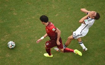 Germany's Thomas Mueller, who got plenty of attention for scoring three goals in the game, was tapped ever so lightly on the face—or was it even really the face?—and went reeling to the ground.