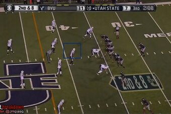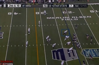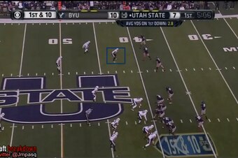 A textbook example of that came in the following play from the BYU-Utah State game, on which Van Noy lined up as if to cover a slot receiver, but he ended up attacking off the snap and blowing up a run play in his direction for a 5-yard tackle for loss.