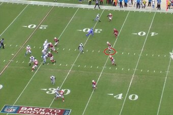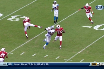 As good as he was in 2013, Dansby missed on having an additional three or four interceptions with gaffes like this one. This is the only one that ended disastrously for the defense, however. Peterson gets caught looking at Dansby because he assumed his teammate picked it off. Meanwhile, Johnson turns a five-yard slant into a 72-yard touchdown.