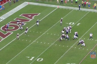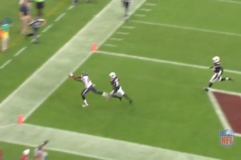 Whatever the case, Peterson has Graham all by his lonesome on the outside, and he did not fare well. It’s a quick slant, and Graham is just too big and strong for Peterson to bring him down before crossing the goal line.