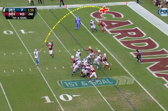 Placement of the ball is important here. Despite being out of position after being shielded by Burleson and Mathieu, Peterson could have picked this ball off and taken it to the house had Stafford underthrown it or not lofted it enough.