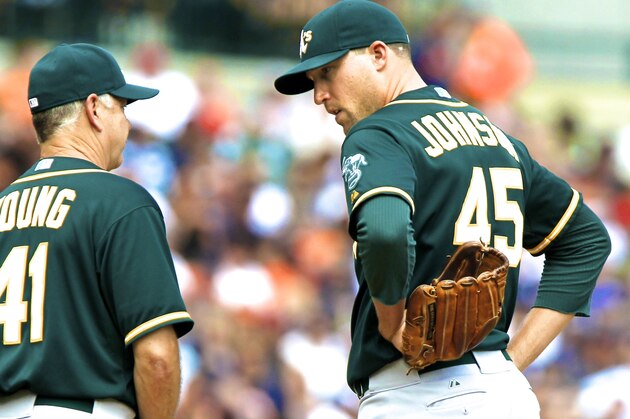Johnson eventually agreed to a one-year, $10 million deal with the A's after the trade and started the season as their closer. That quickly imploded on manager Bob Melvin when the right-hander allowed five runs in his first two games and had an ERA of 7.14 with 60 hits allowed in 40.1 innings before being designated for assignment.