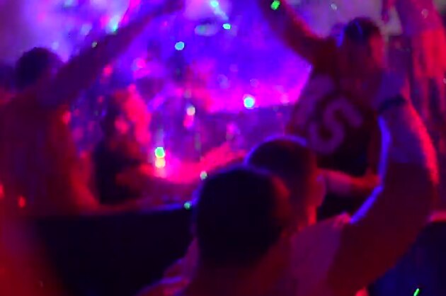 What you are watching is not an impromptu event. Someone set up a tent and rented out laser lights and smoke machines for this. Air horns and a disco ball were involved.