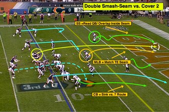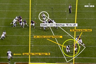 On Friday night, the Bears showed this same concept out of a 3x1 formation when Jay Cutler targeted tight end Zach Miller versus the Eagles' two-deep shell.
