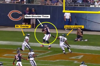 The Bears quarterback puts this ball on Miller's back shoulder (away from the defender’s leverage) and gives his tight end an opportunity to finish the play for six points in the back of the end zone.