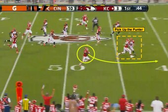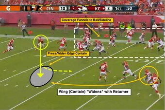 The Bengals' coverage unit funnels (or squeezes) to the ball on a “red” kick (red=right, white=middle, blue=left). That forces the coverage lanes to break down and allows Thomas to work back to the wide side of the field.