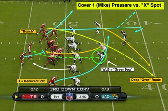 This is a straight five-man pressure (Mike ‘backer) from the Jaguars with the defensive backs playing Cover 1 rules in the secondary (press the point man in a bunch alignment) versus the “X” Spot.