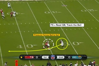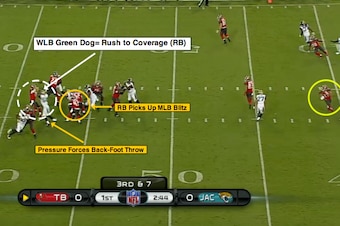 Let’s break down the blitz scheme and talk about the “green dog” technique from rookie linebacker Telvin Smith that forced McCown to sail this ball over Mike Evans' head.