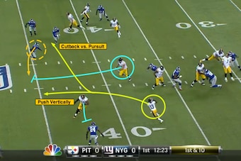 With the center releasing to block the strong-side force (defensive back in coverage) and guard David DeCastro picking up the Mike ‘backer redirecting to the middle of the field, Archer can press this ball up the field or look to cut back.