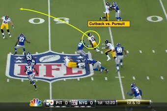 With the edge of the coverage unit now extended because of Thomas’ ability to press the ball to the wide side of the field, the rookie can create an inside running lane, make a smooth cut and attack vertically up the field.