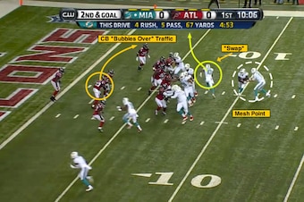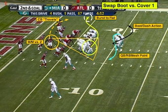 In the “swap” boot, the Dolphins will show the mesh point action in the backfield to force second-level defenders to flow, while Gibson comes under the line of scrimmage to the closed-side flat.