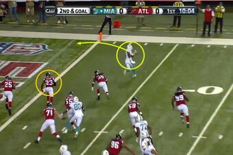 However, once Gibson comes back under the line to the closed side, Alford has to work through the second-level traffic with Tannehill on the dash/boot action off the mesh point.