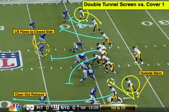 With the Steelers in an empty formation (no backs in the backfield), the offense can widen the underneath defenders in man coverage and run the double-wide receiver “tunnel” screen.